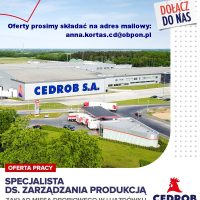 „Wyrażam zgodę na przetwarzanie moich danych osobowych przez CEDROB S.A. z siedzibą w Ujazdówku Ujazdówek 2a, 06-400 Ciechanów, w celu prowadzenia rekrutacji na aplikowane przeze mnie stanowisko”.